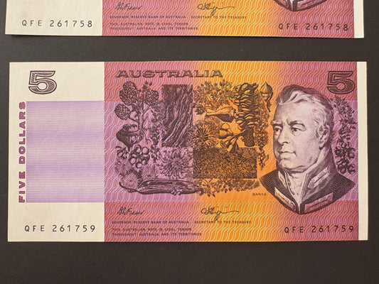 1990 $5 Uncirculated Paper Banknotes - Fraser Higgins - Consecutive Run x4