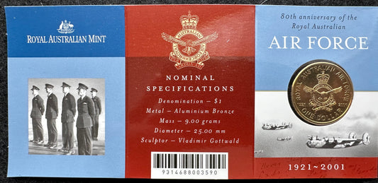 2001 $1 80th Anniversary of the Royal Australian Air Force RAAF coin on card
