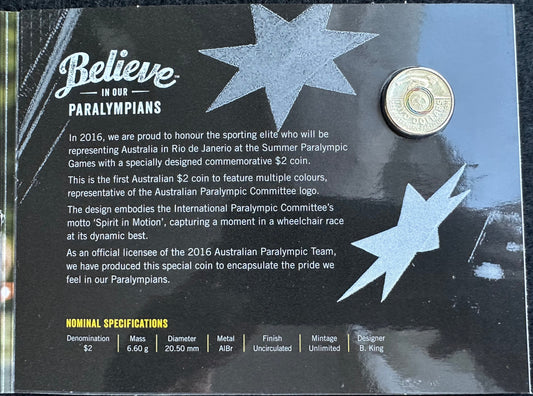 2016 Australian Paralympics Coloured $2 Dollar coin in Folder RAM release