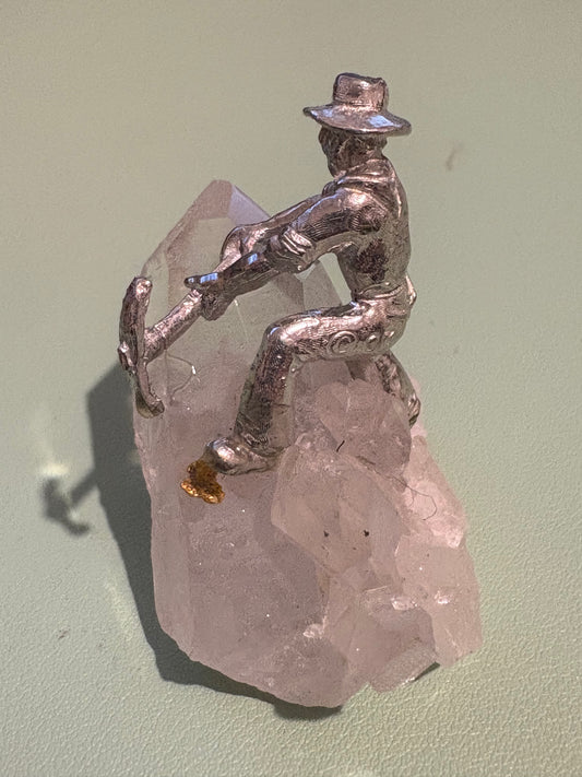 Pewter Gold Prospector with Pocket Treasure Gold Nugget and Calcite Quartz Crystal