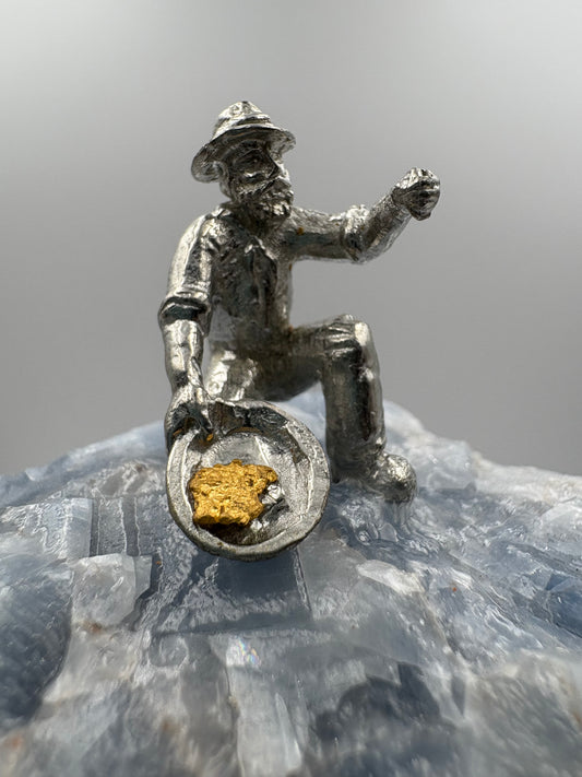 Pewter Gold Prospector with - Pocket Treasure Gold Nugget and Blue Calcite Crystal