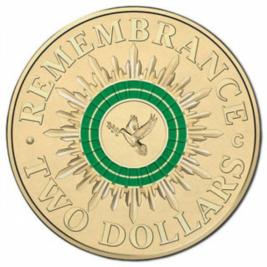 2014 $2 Uncirculated 'C' Mintmark Coloured Coin - Remembrance Day Green Dove in Tri-fold card