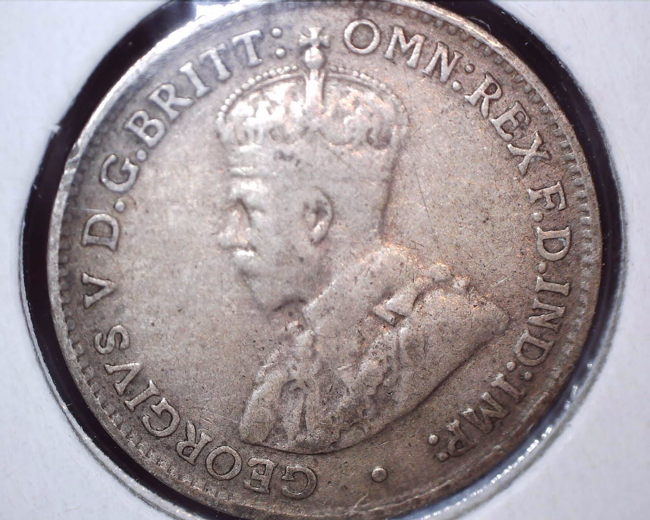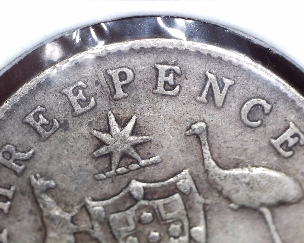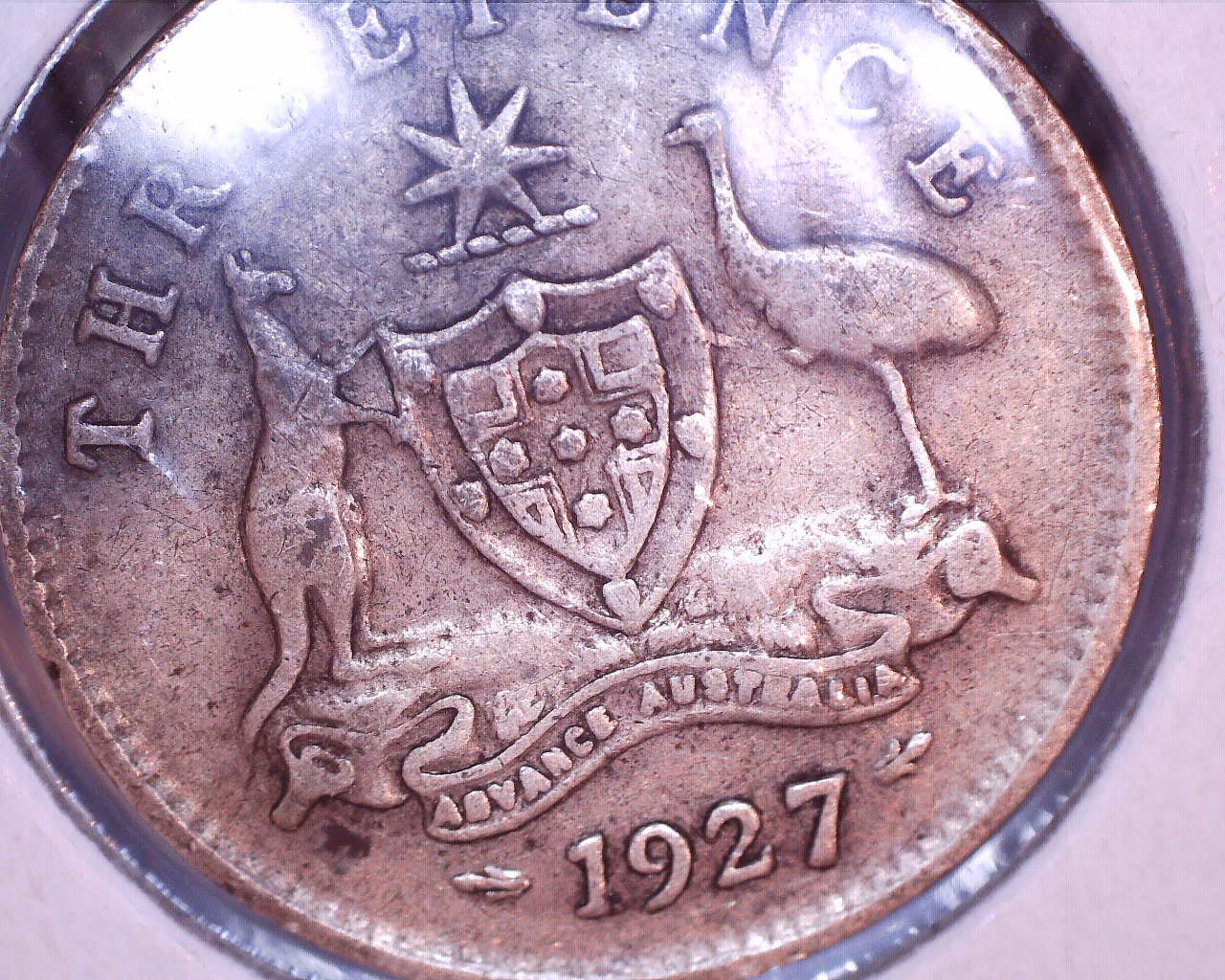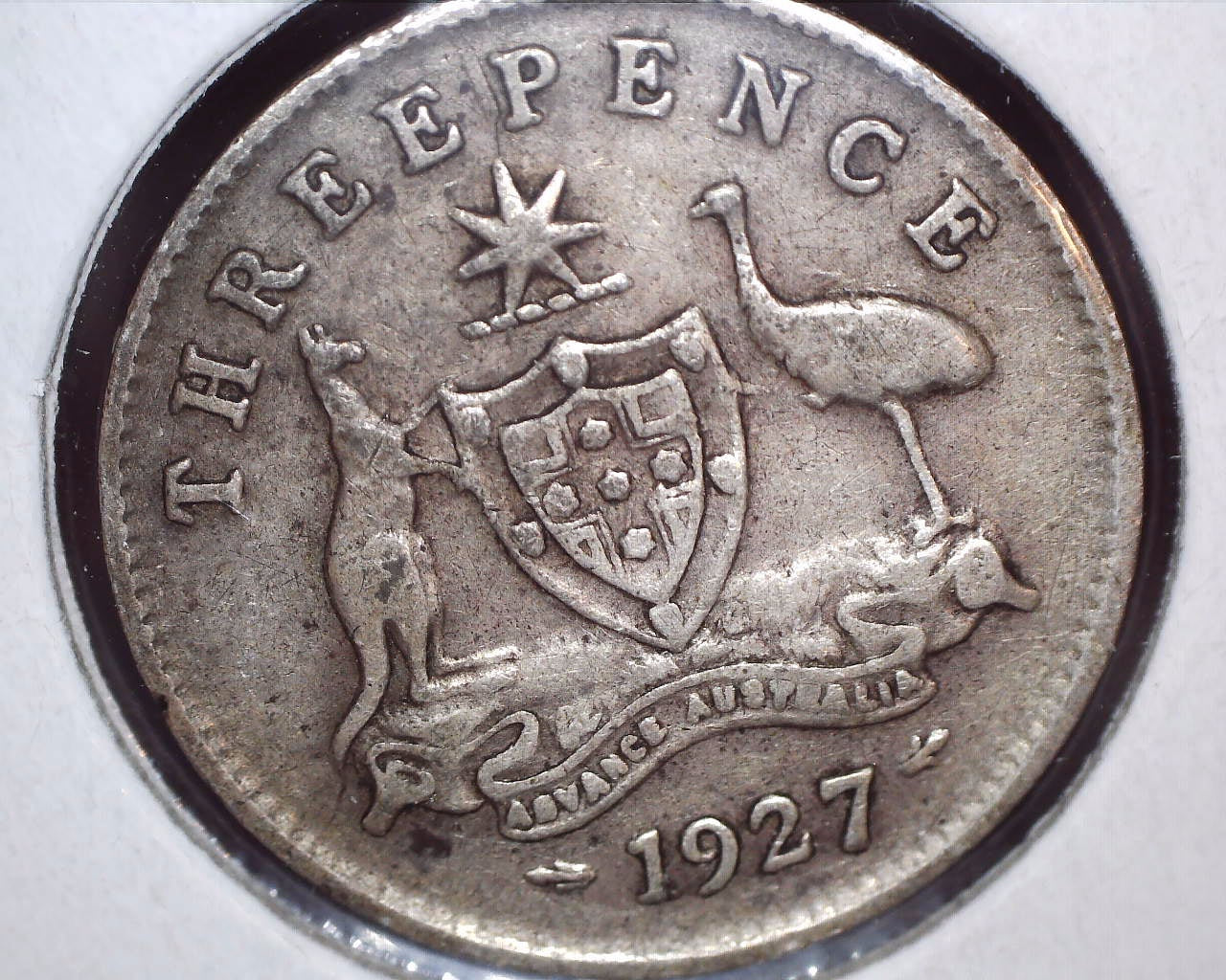 1927 Australian Three Pence - 92.5% Silver - Break in Emu Leg Error