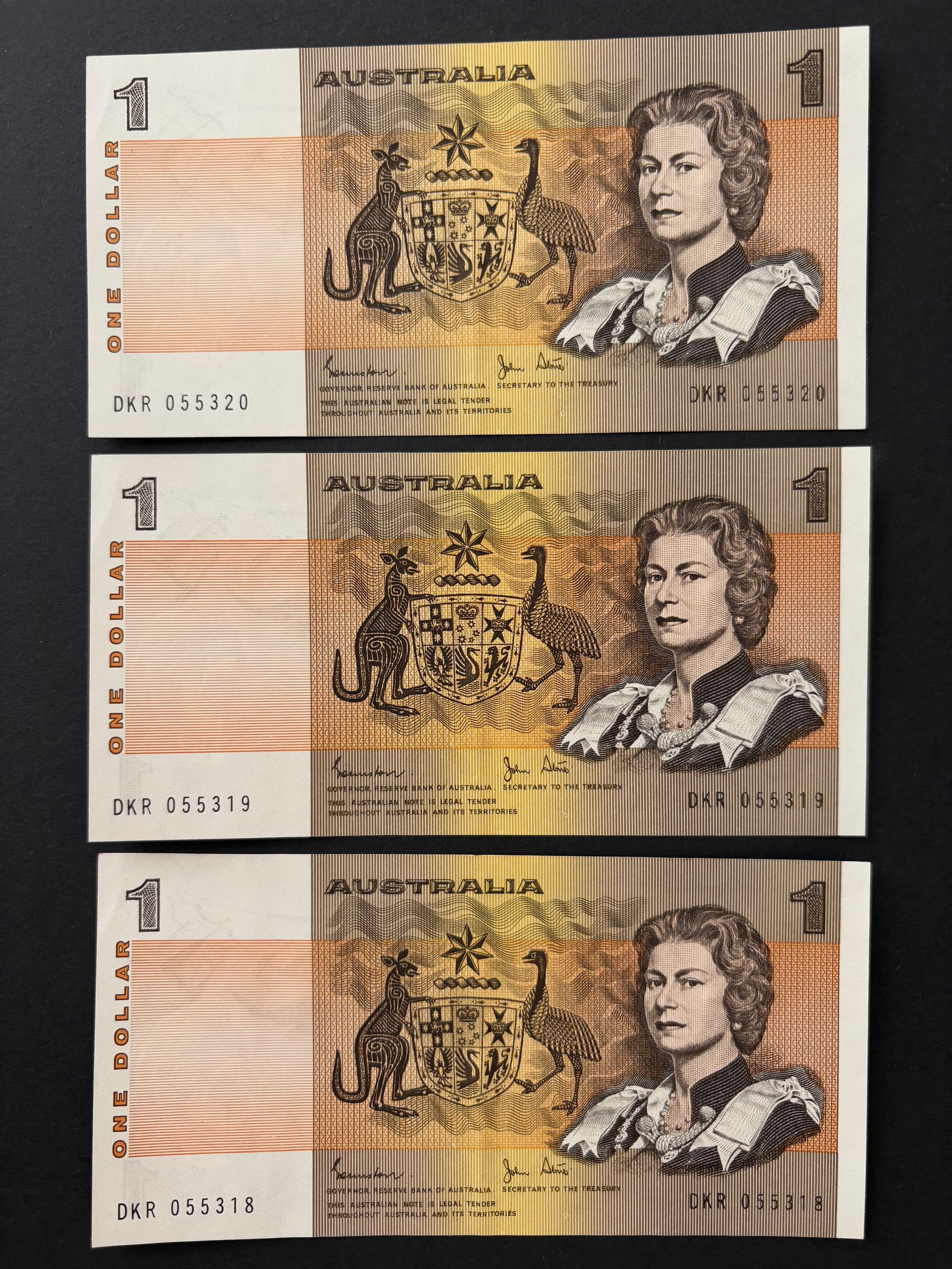 1982 $1 Australia Paper Banknotes - Johnston Stone - Consecutive Run of 3